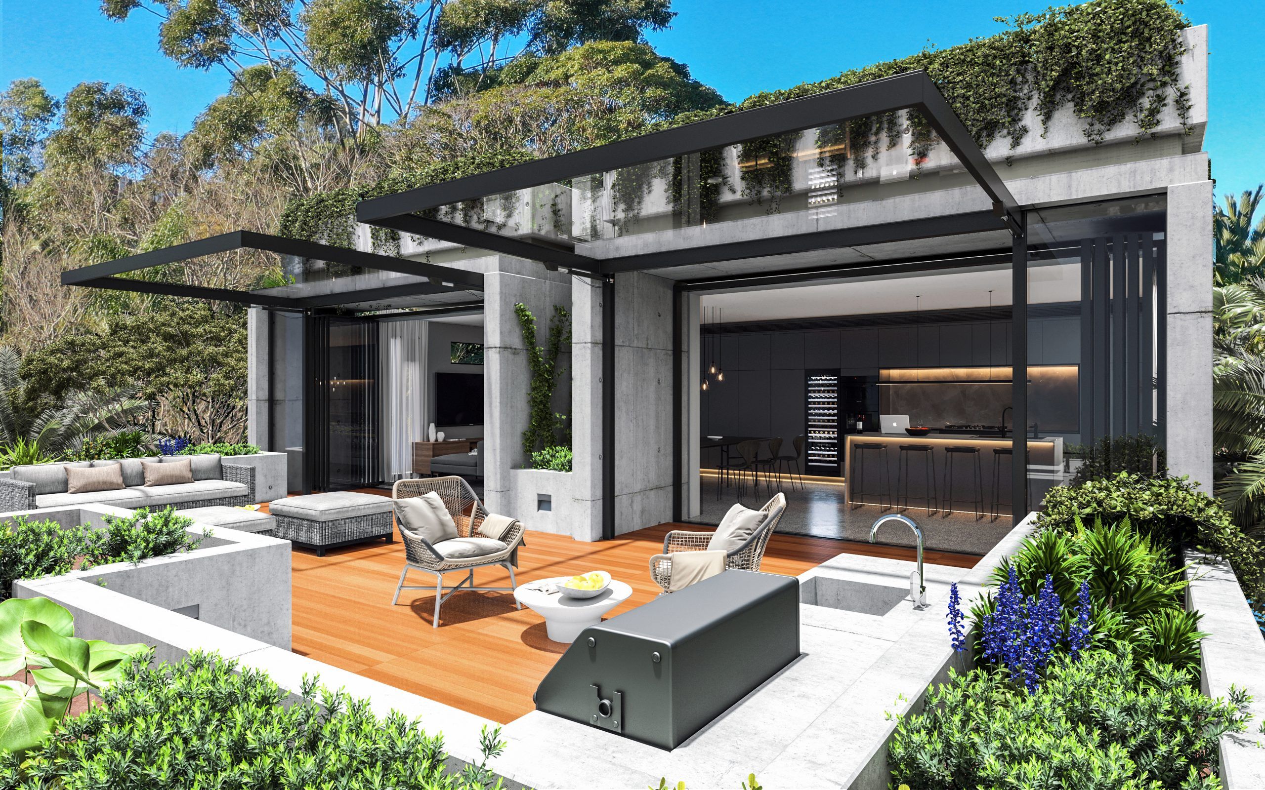 Raw yet remarkably refined, an edgy composition of concrete, glass and matte black accents have created a sanctuary of style looking out to the surrounding greenery and considered landscaping. Timelessly sophisticated, the integrated living spaces work in harmony with the outdoors instilling a relaxed holiday vibe. The entertainer’s hub is centred around the state-of-the-art stone kitchens fitted with a full suite of Miele appliances and Vintec wine fridges. Protected without sacrificing aesthetics or light, a hydraulic glazed awning system on the terraces extends the living area no matter the weather.