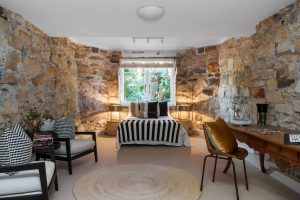 Down the carpeted staircase and voila, a two-bedroom entirely separate apartment with an exposed stone bedroom that is just, oh my gosh, divine. It’s inspired and inspiring. Go see!